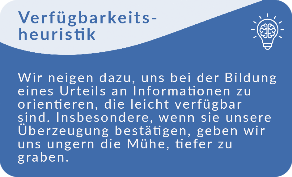 Heuristiken sind mentale Daumenregeln, die uns im Alltag helfen, mit wenigen Informationen hinreichend gute Entscheidungen zu treffen. Sie können uns aber auch leicht auf den Holzweg führen, insbesondere in Bereichen, wo wir wenig Wissen und Erfahrungen haben. Mehr dazu erfahren Sie hier: