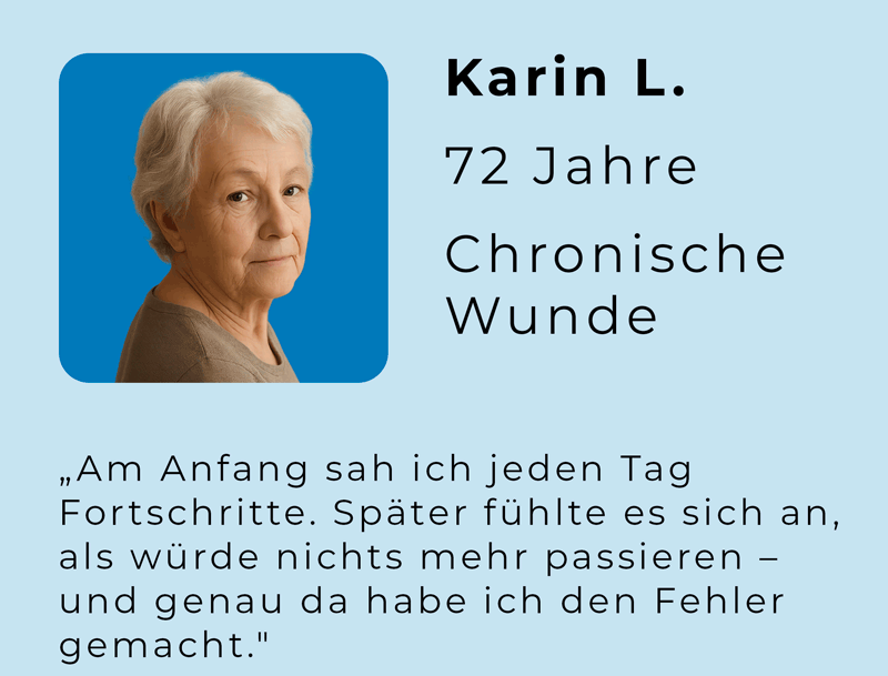 Karin L. ist 72 Jahre alt und lebt seit Jahren mit einer chronischen Wunde am Unterschenkel. Sie erzählt offen von ihrem Umgang mit der langwierigen Therapie, weil sie möchte, dass andere Patient:innen nicht dieselben Fehler machen wie sie: Eine Behandlung abzubrechen, nur weil sie mühsam und belastend ist. Heute weiß sie, dass ihr Zögern den Heilungsprozess verlängert hat. Mit ihrer Geschichte will sie anderen Mut machen, durchzuhalten – auch wenn es schwerfällt.