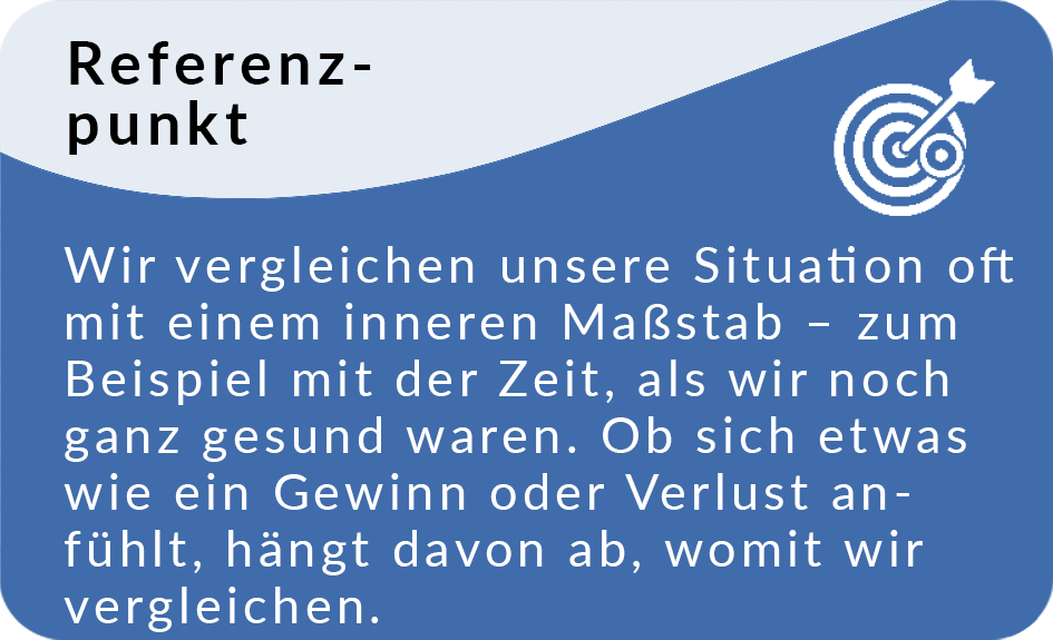 Dabei spielte der sogenannte Referenzpunkt eine zentrale Rolle. Er beschreibt die Perspektive, aus der wir eine Situation bewerten. Zu Beginn war Karins Referenzpunkt die sechs Zentimeter große Wunde. Nach einigen Wochen waren es nur noch drei Zentimeter. Dieser neue Stand wurde für sie zur Normalität – zum neuen Referenzpunkt. Aus dieser Sicht erschienen die weiteren Fortschritte klein, der Aufwand dagegen groß. Genau diese Verschiebung führte dazu, dass Karin die Therapie abbrach.