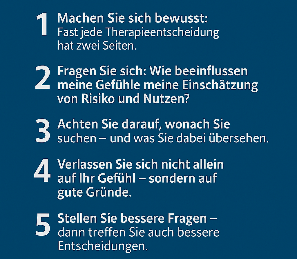Das Problem: Eine Entscheidung, die sich gut anfühlt, ist nicht automatisch eine gute Entscheidung. Gerade in der Medizin kann das Gefühl trügen – besonders dann, wenn der Nutzen einer Behandlung still im Hintergrund wirkt, während Risiken emotional laut werden.