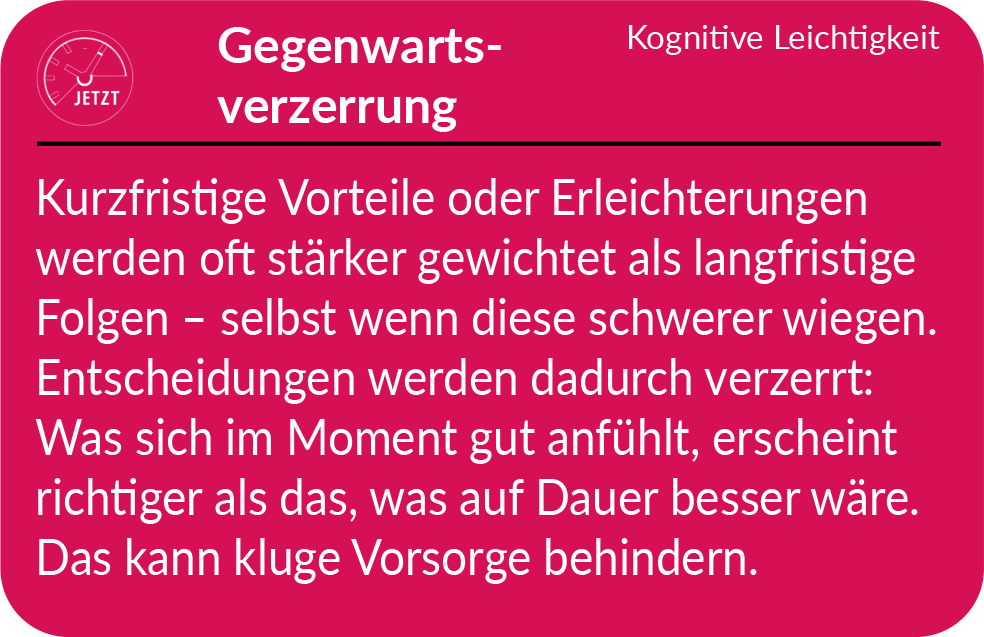 Ein Denkmuster, das bei Laras Entscheidung eine Rolle gespielt hat, war die sogenannte Gegenwartsverzerrung. .