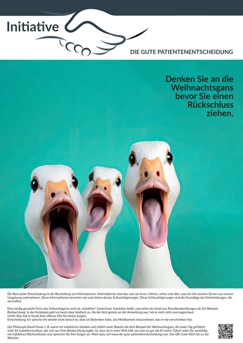 Das Poster warnt vor voreiligen Urteilen. Denn wie die Gans, die glaubt, sie sei sicher, weil sie täglich Futter bekommt, neigen auch wir dazu, aus einzelnen Beobachtungen falsche Schlüsse zu ziehen.