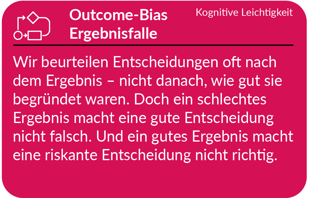 Der Outcome-Bias gehört zu einer Gruppe von systematischen Fehlern beim Wahrnehmen, Urteilen und Entscheiden. Mehr über solche Fehler lesen Sie hier: