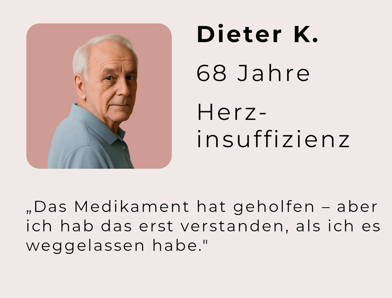 Dieter K., 68, lebt mit einer Herzschwäche. Ein modernes Kombinationspräparat (Sacubitril/Valsartan) brachte ihm spürbare Besserung – so sehr, dass er in einem Moment des „Es geht mir doch gut“ die Tabletten eigenmächtig absetzte. Sechs Wochen später folgte der Rückschlag und ein erneuter Krankenhausaufenthalt.
